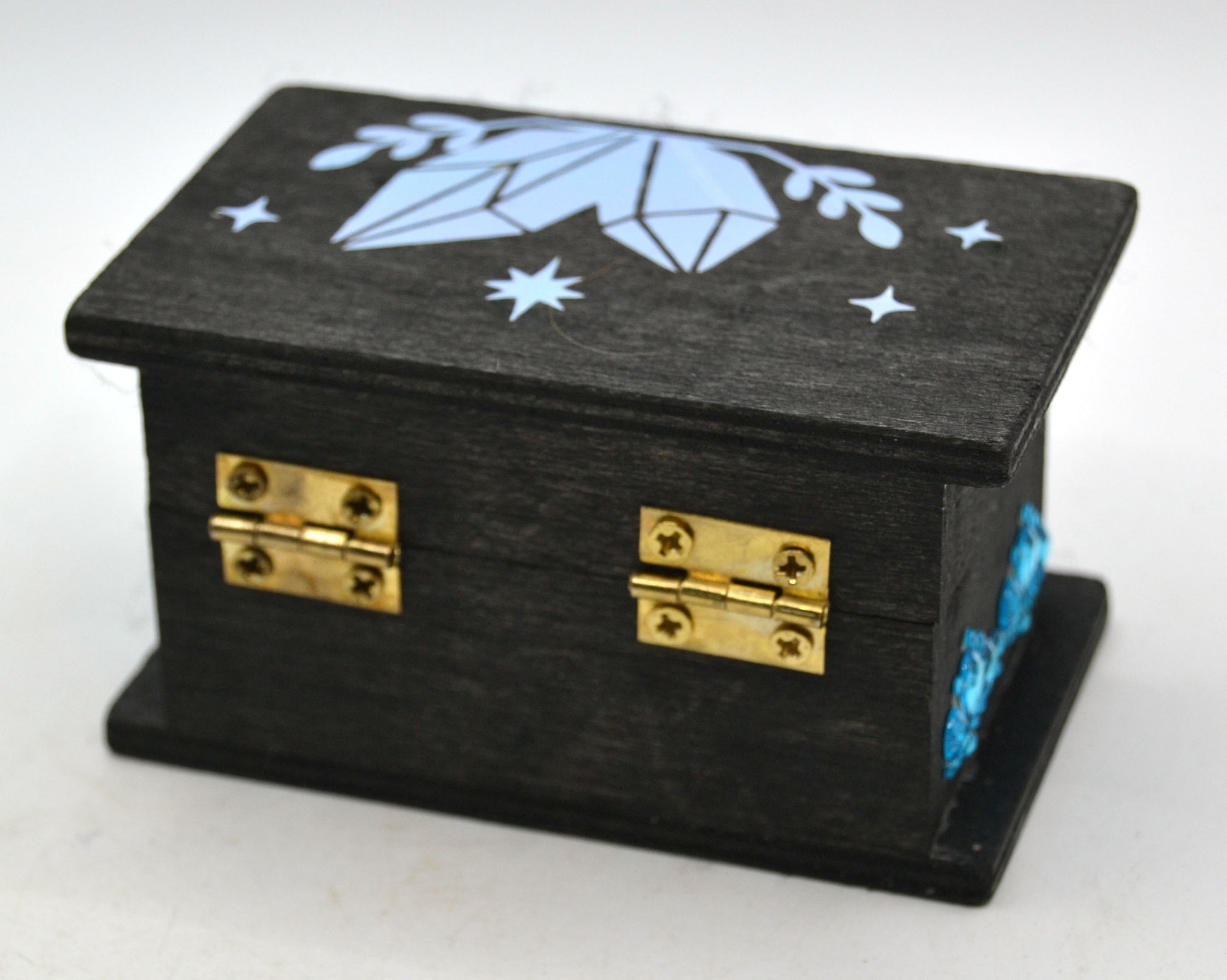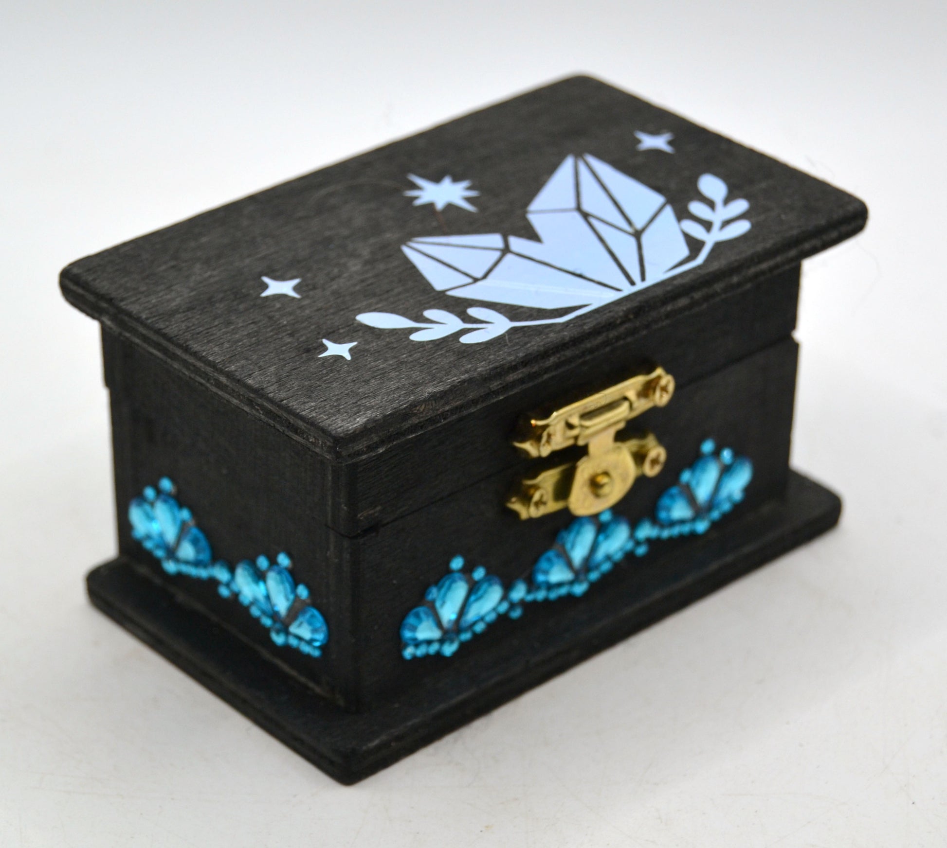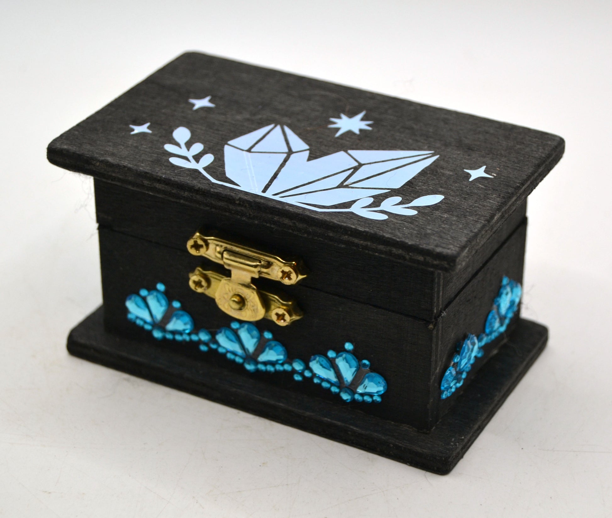 A jeweled wooden keepsake chest (approx. 3.5" x 2" x 3.75"), with a printed meaning card affixed inside the lid