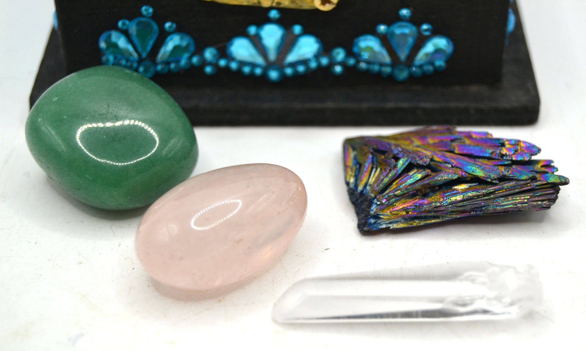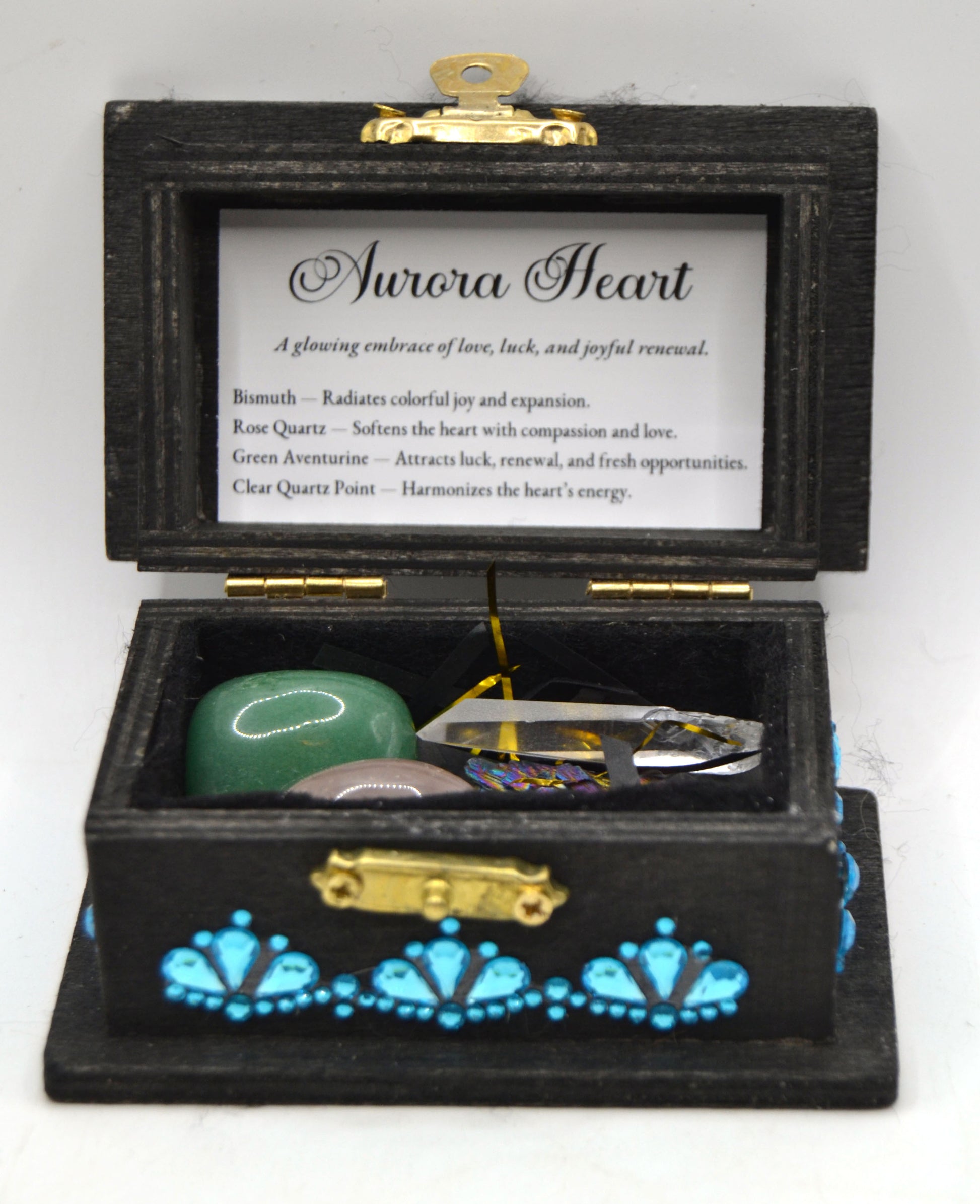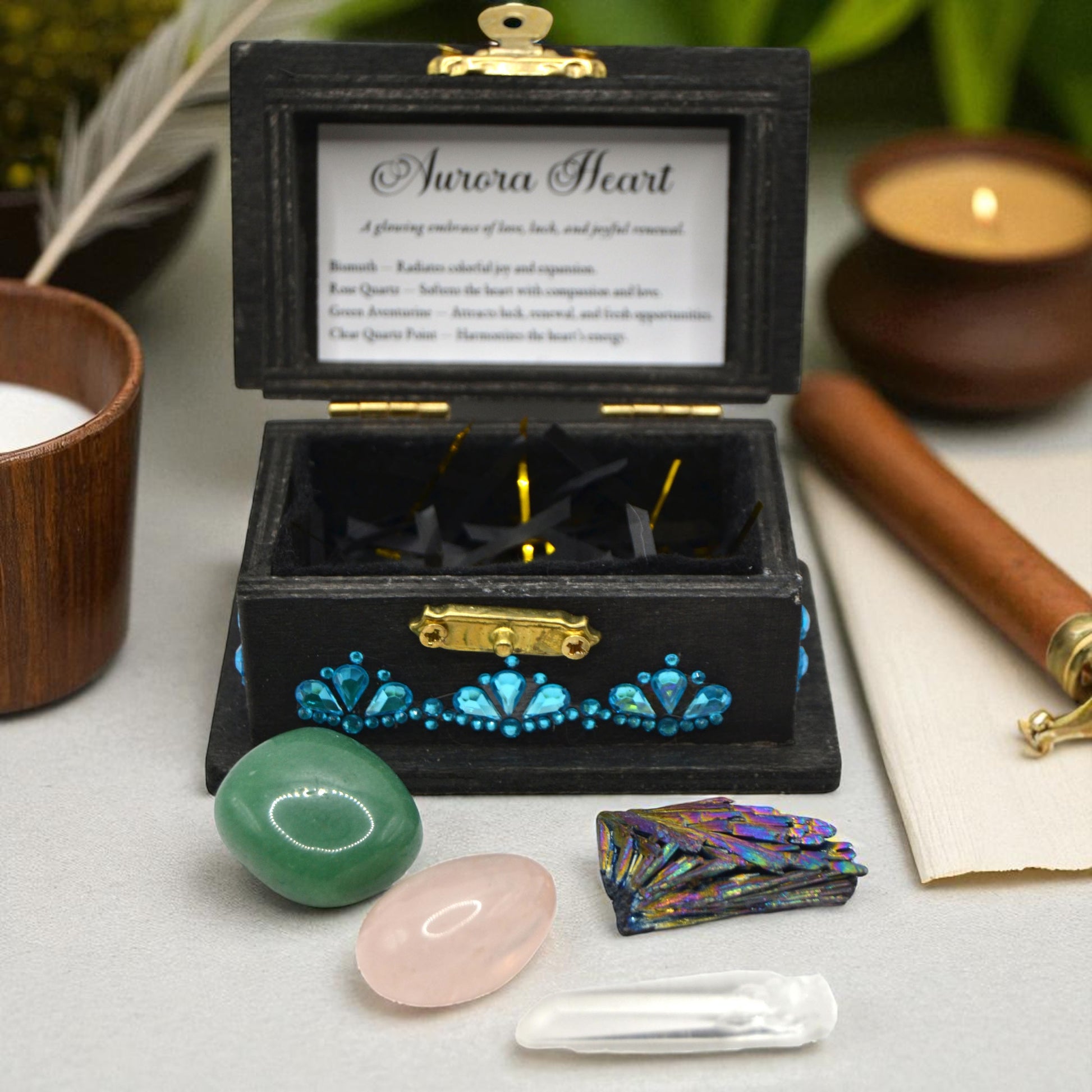 Aurora Heart - A glowing embrace of love, luck, and joyful renewal. This keepsake radiates with the shimmer of possibility and the warmth of compassion. Like the northern lights dancing across the night sky, its stones call in expansion, luck, and harmony of the heart. A set for dreamers, lovers, and those ready to open to fresh beginnings.