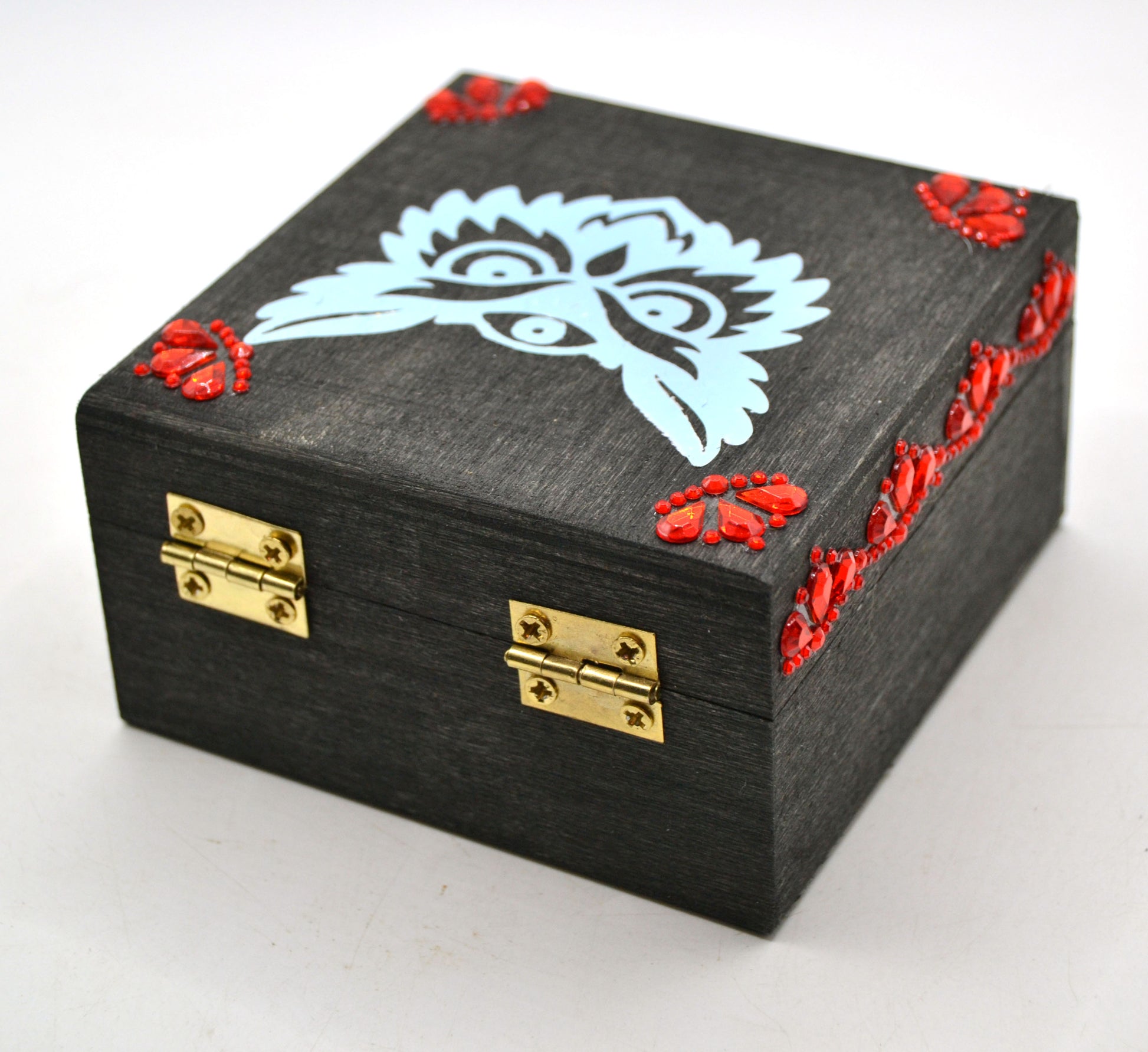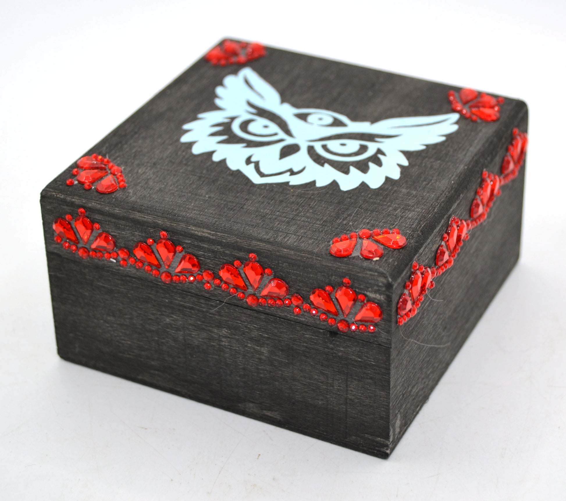 A jeweled wooden owl box (approx. 3.5" x 3.5"), with a printed meaning card affixed inside the lid