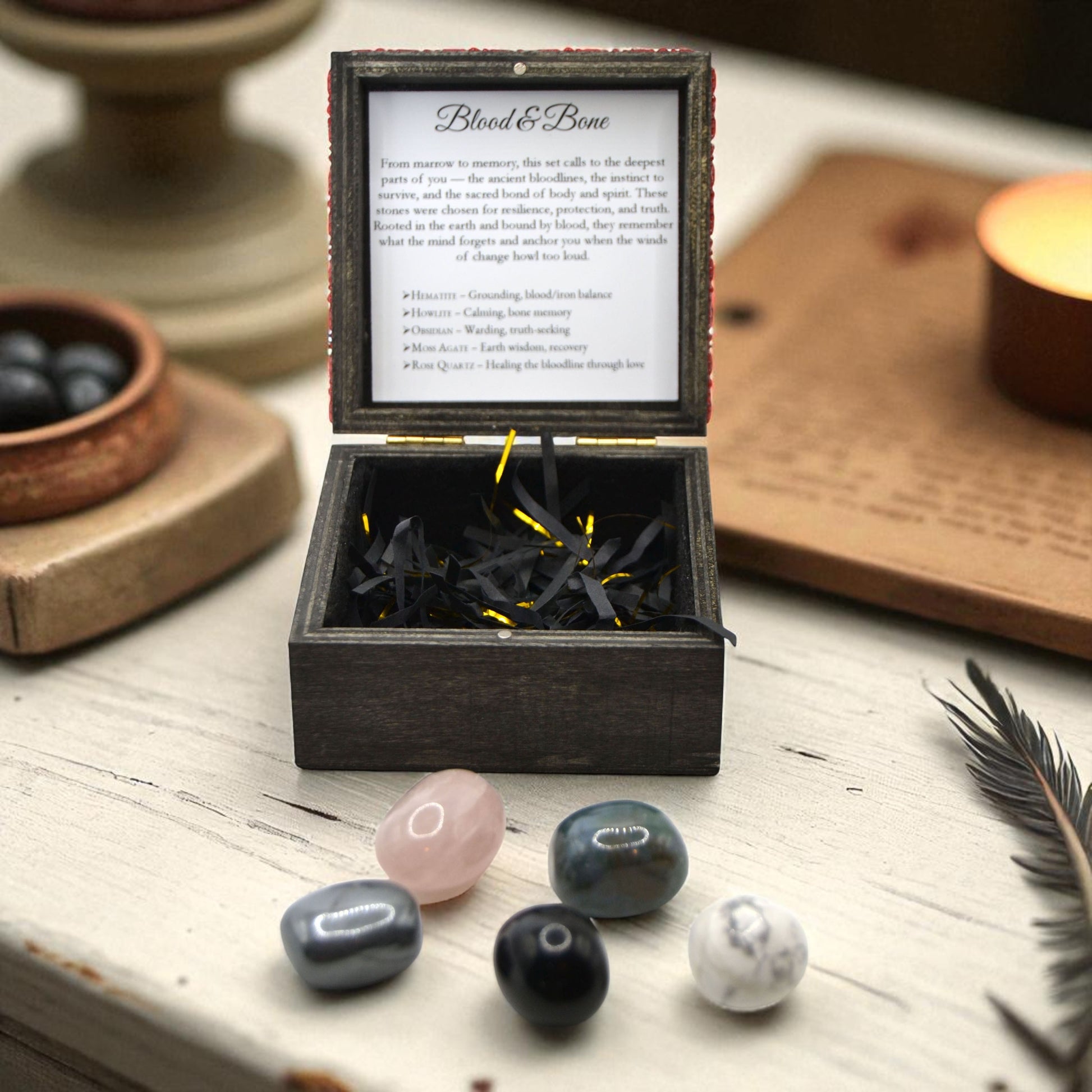 Blood & Bone - From marrow to memory, strength endures. This set calls to the deepest parts of you, the ancient bloodlines, the instinct to survive, and the sacred bond of body and spirit. Each stone was chosen for resilience, protection, and truth. Rooted in the Earth and bound by blood, they remember what the mind forgets and anchor you when the winds of change howl too loud.