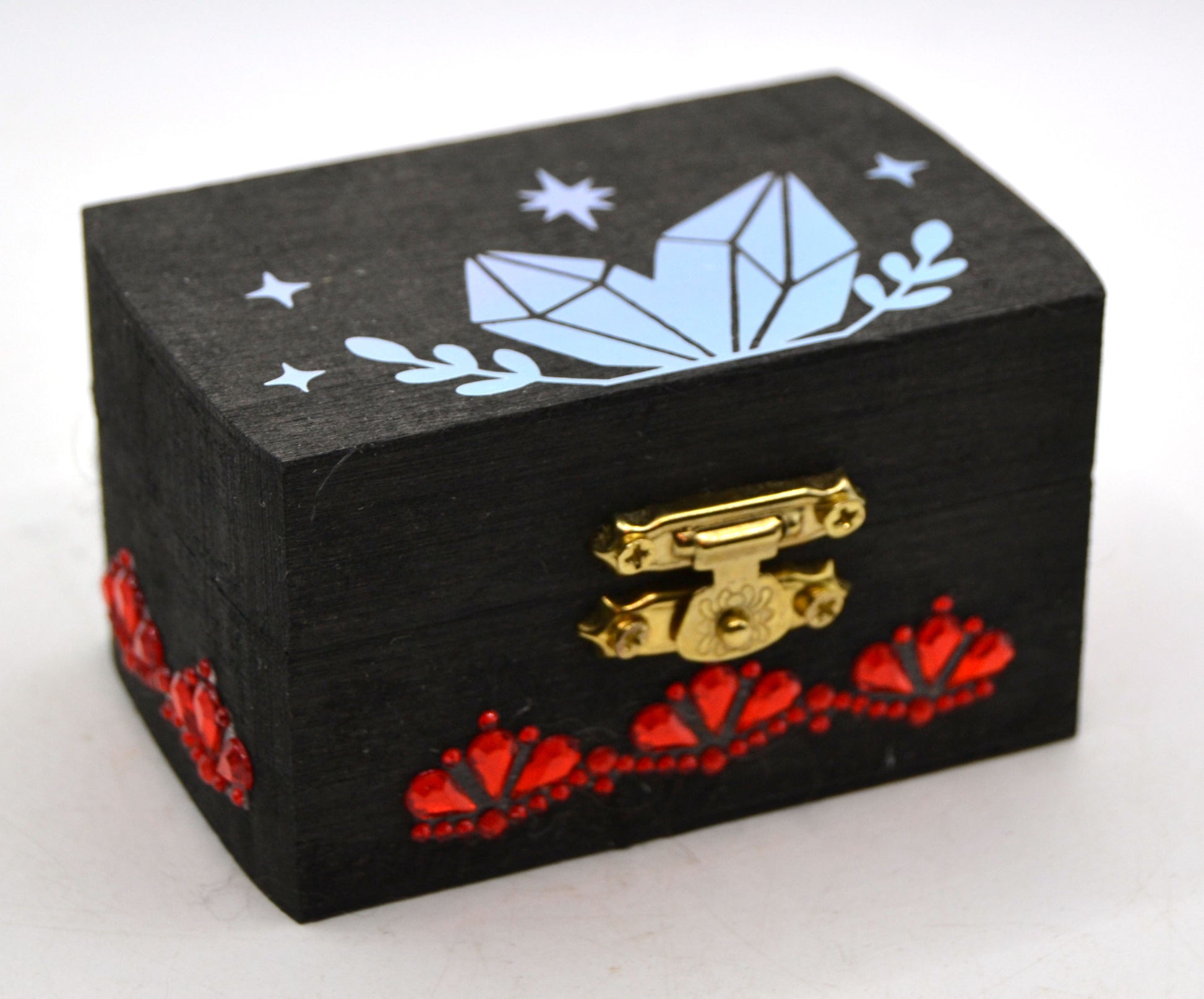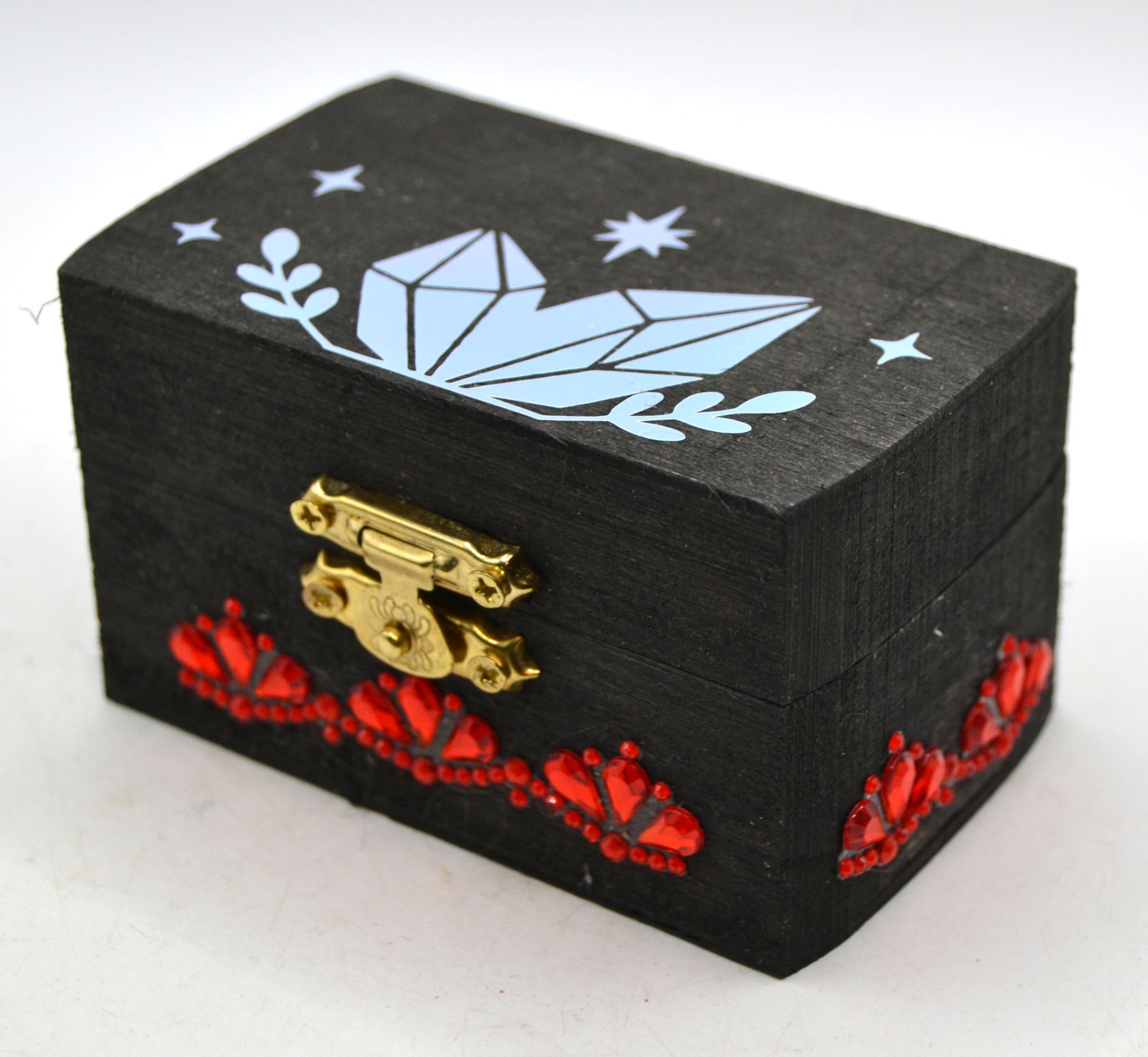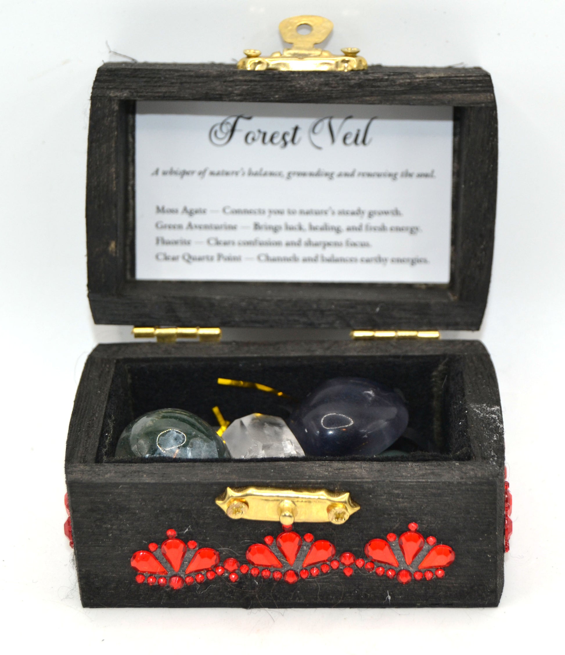 A jeweled wooden keepsake chest (approx. 3.25" x 2" x 2"), with a printed meaning label affixed inside the lid