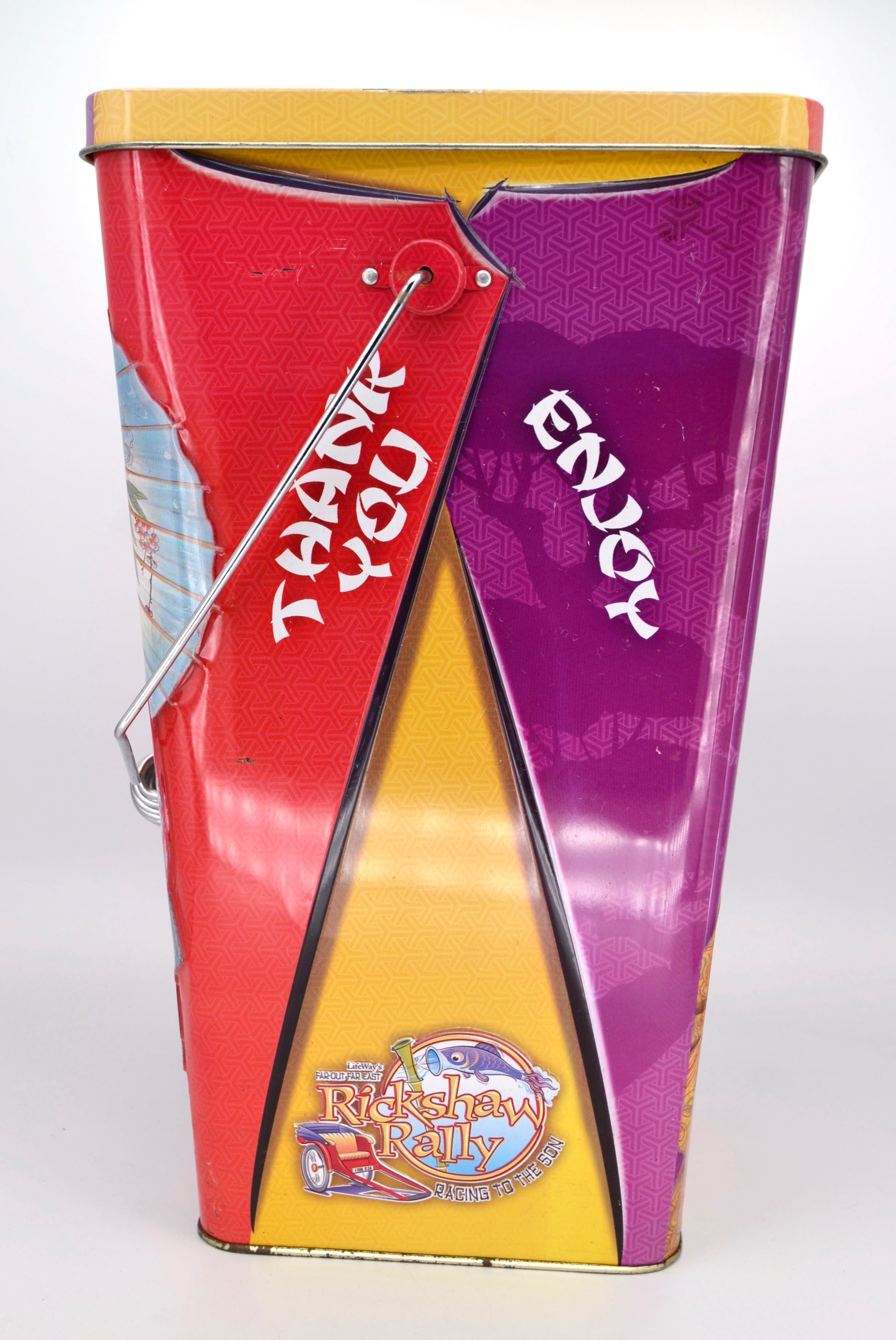This tin was produced in connection with LifeWay Christian Resources’ 2004 Vacation Bible School program, titled “Far-Out Far East: Rickshaw Rally – Racing to the Son.”