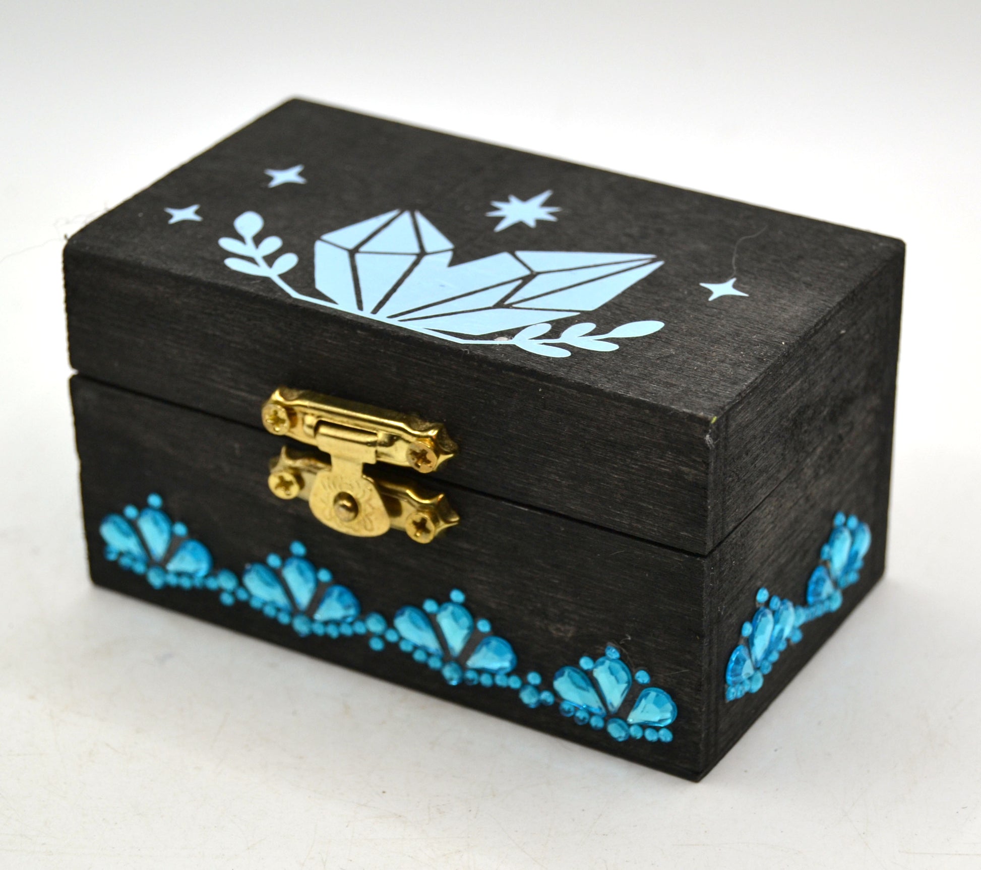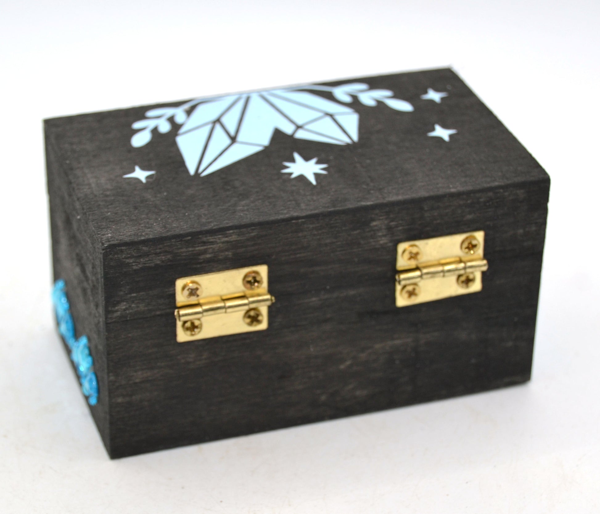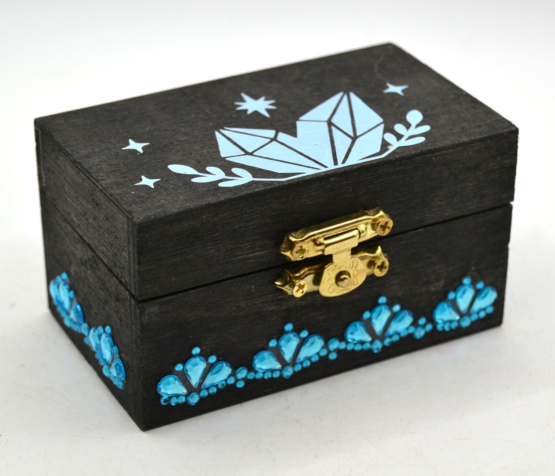A jeweled wooden keepsake chest (approx. 3.5" x 2" x 2"), with a printed label affixed inside the lid