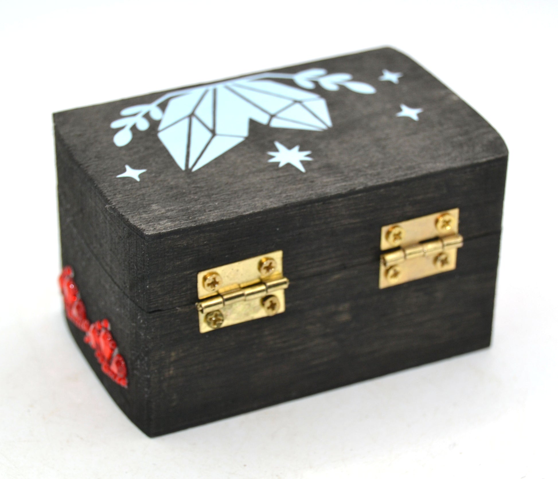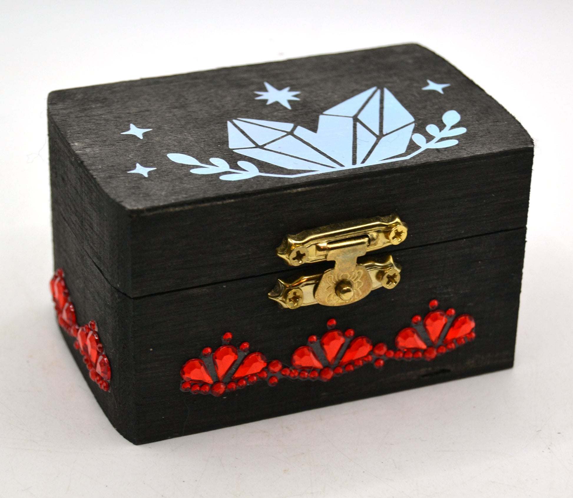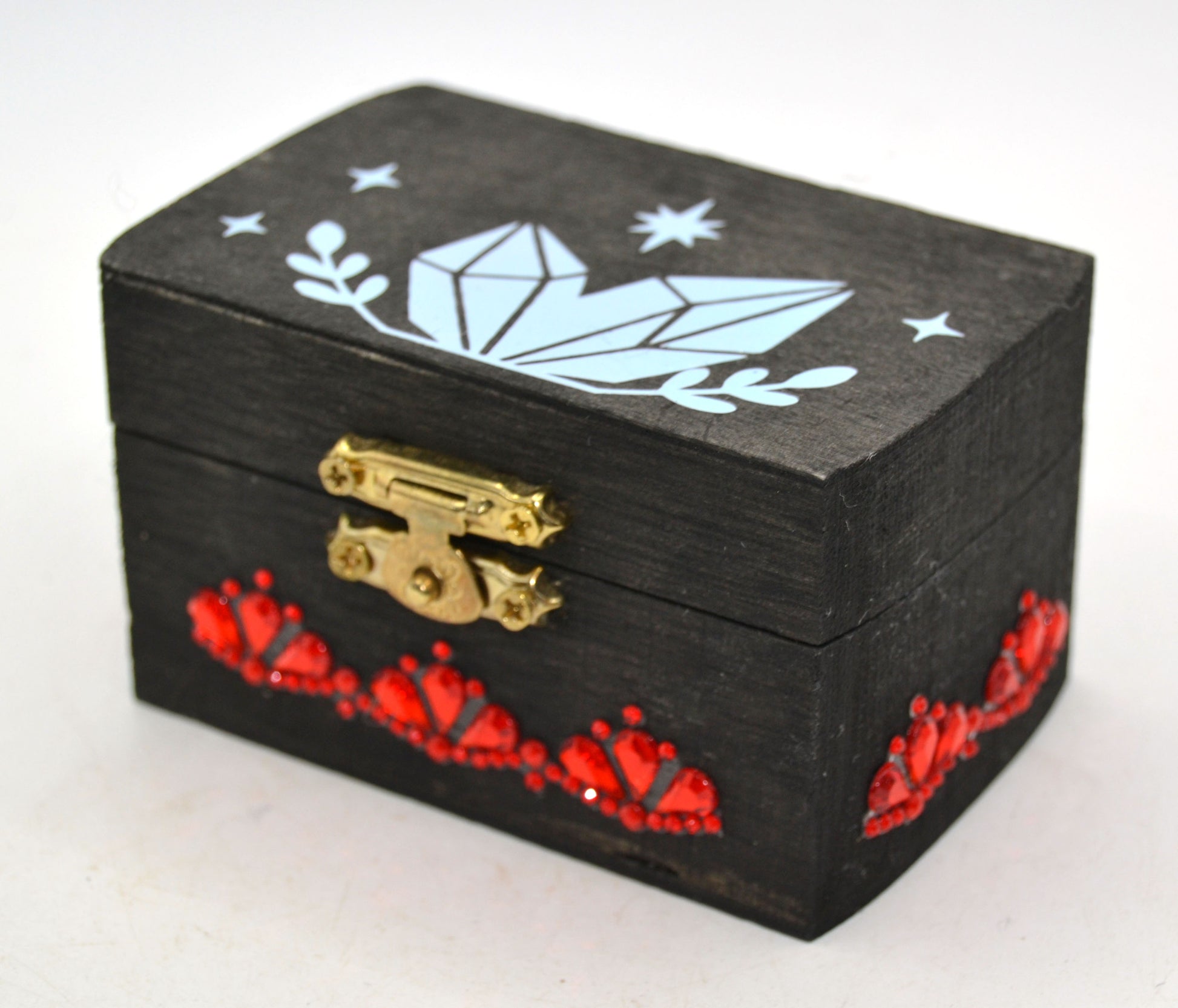 A jeweled wooden keepsake chest (approx. 3.25" x 2" x 2"), with a printed meaning label affixed inside the lid