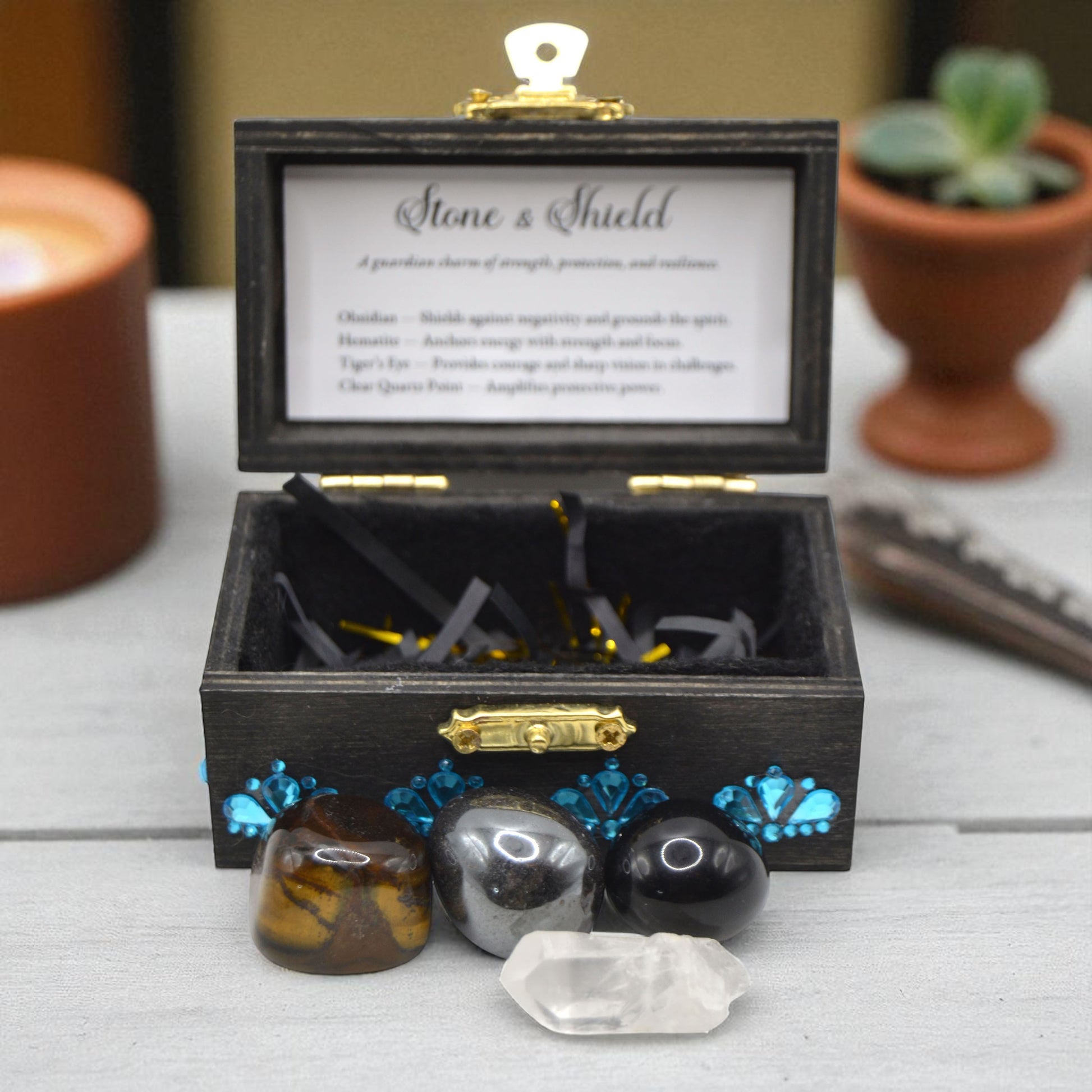 Stone & Shield - A guardian charm of strength, protection, and resilience. This handcrafted set calls upon the power of grounding stones to steady the spirit and guard against negativity. Whether kept on your altar, carried as a talisman, or gifted as a symbol of protection, Stone & Shield weaves courage and clarity into your journey.