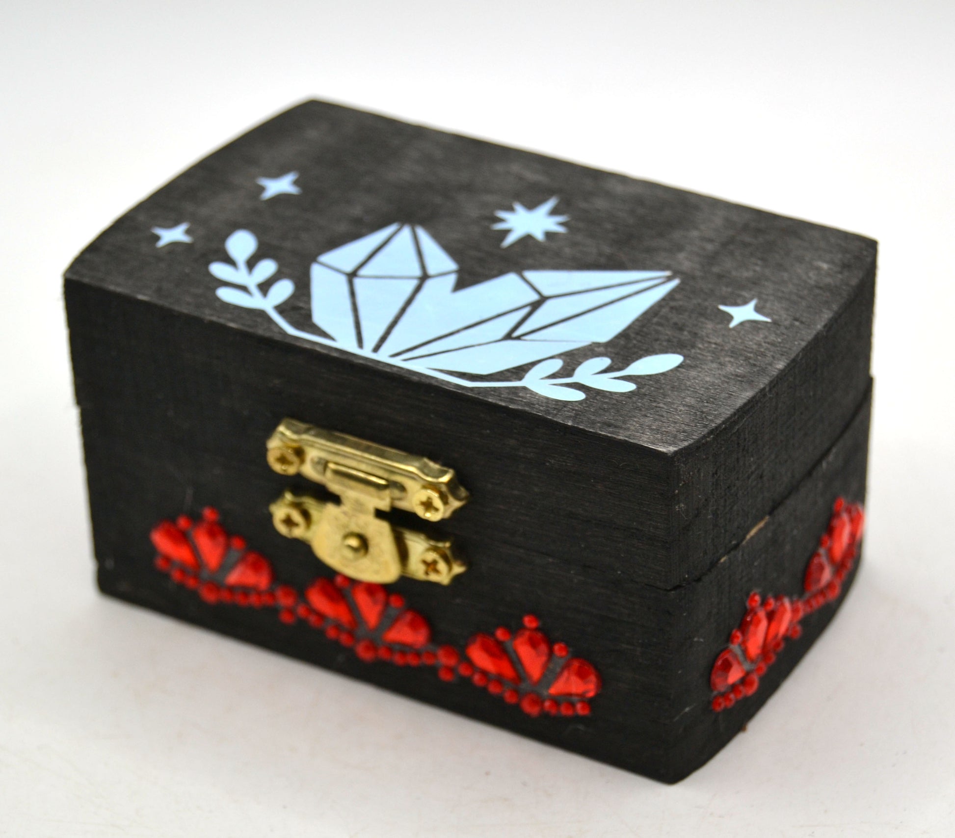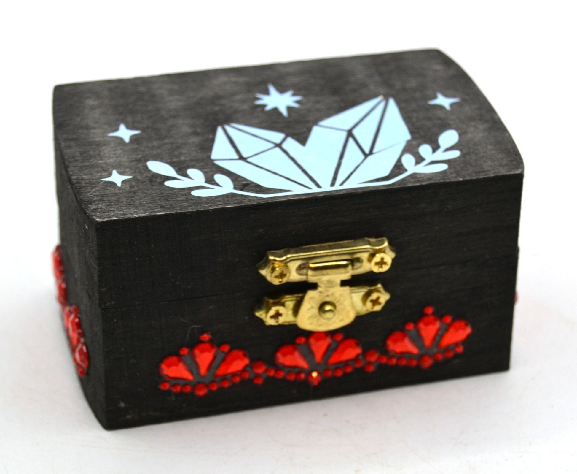 A jeweled wooden keepsake chest (approx. 3.25" x 2" x 2") with a printed meaning label affixed inside the lid